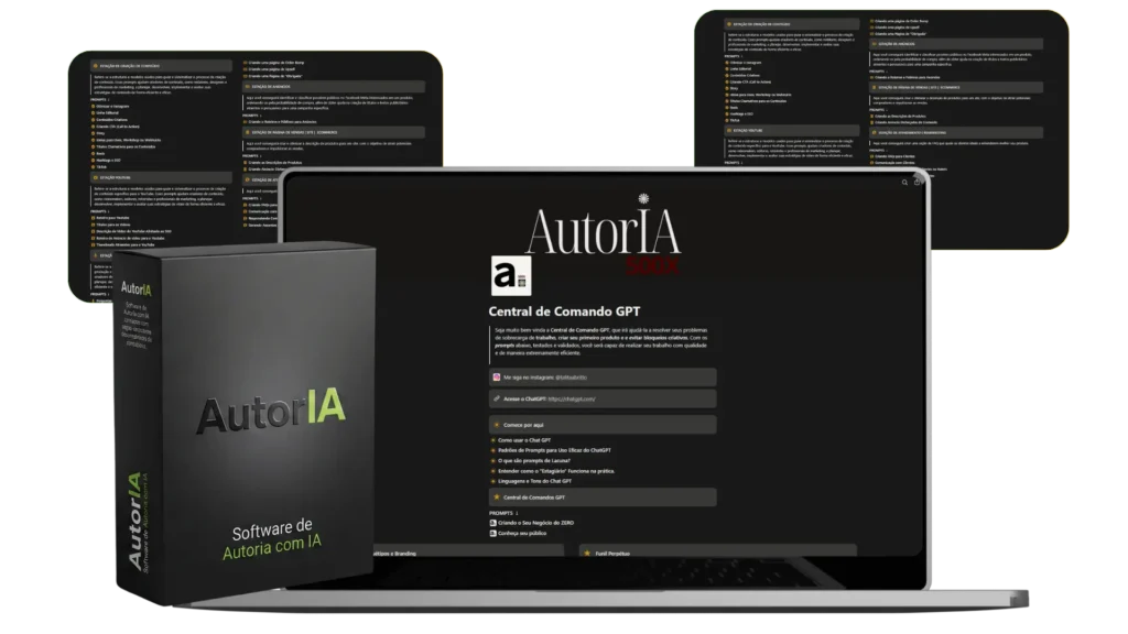 Nada de videoaula enrolada ou material teórico. O AutorIA 500x é uma biblioteca com mais de 800 comandos prontos, organizados por tema.